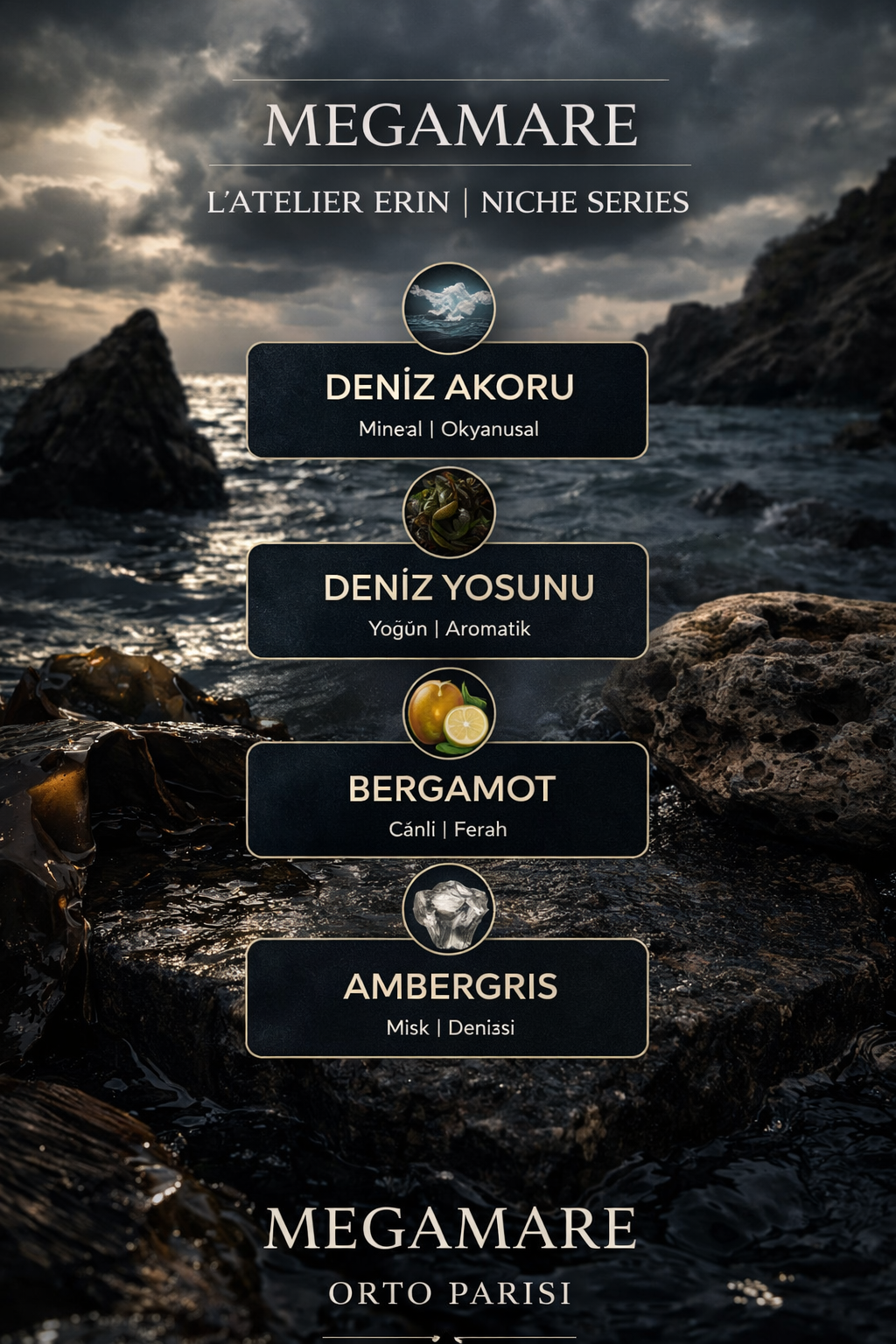 Orto Parisi Megamare muadili olan bu unisex niche parfüm; deniz notaları, tuzlu akorlar ve aromatik dokunuşların güçlü birleşimiyle ferah ve karakteristik bir koku sunar. Ambergris ve odunsu notalarla derinleşen bu parfüm, okyanus esintisini andıran yoğun ve etkileyici bir karaktere sahiptir. Kalıcılığı yüksek, özgün ve dikkat çekici bu koku özellikle farklı ve güçlü parfümleri sevenler için idealdir.